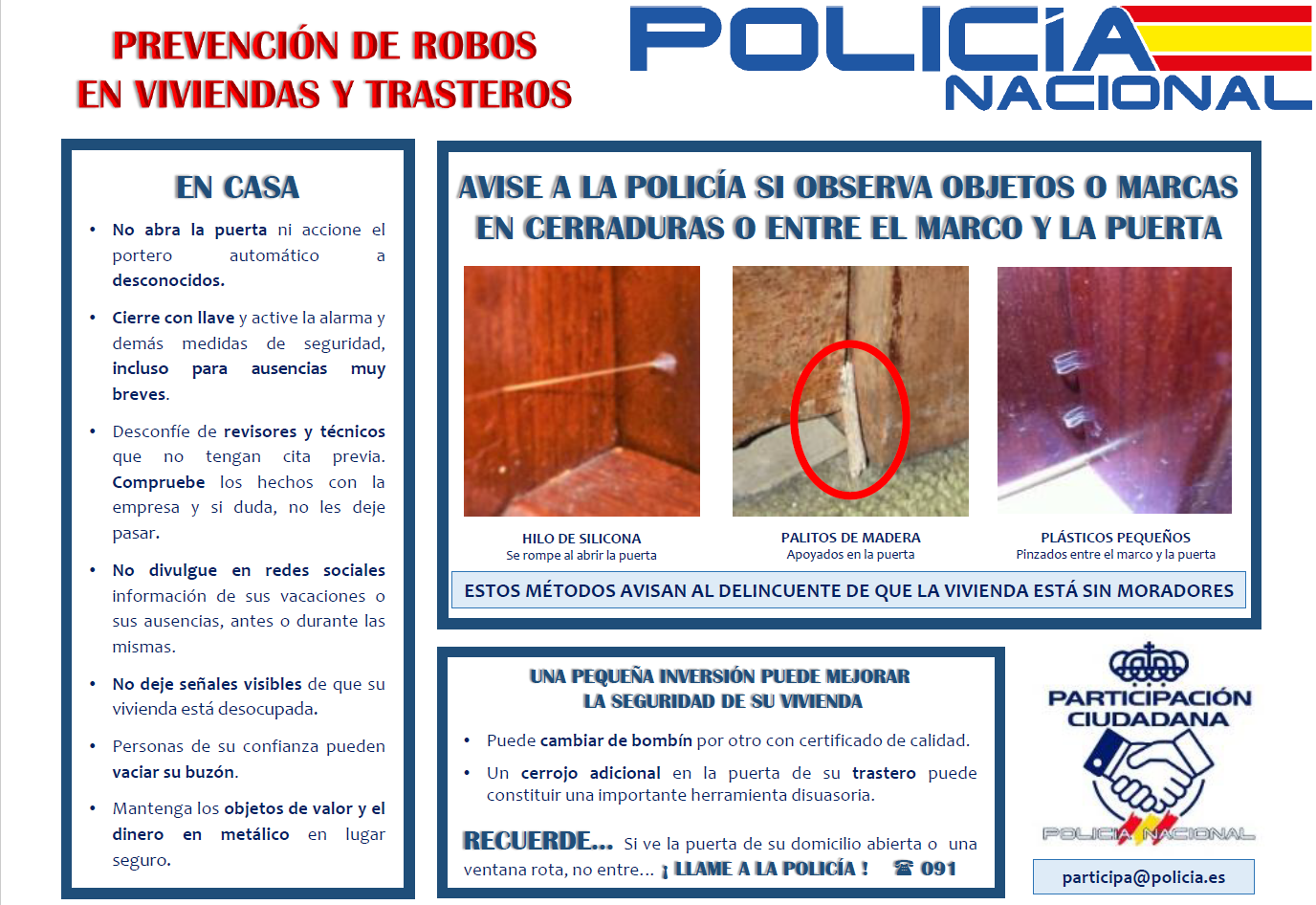 Policía Nacional ha desarrollado una campaña preventiva de robos en viviendas y trasteros, centrada en la importancia que tienen sus elementos de seguridad y sus vulnerabilidades. Los elementos de seguridad instalados en las viviendas, accesos o alrededores, son básicos para evitar intrusiones ilícitas, así como para eludir o, al menos, minimizar el riesgo de ser víctima de un robo con fuerza.
